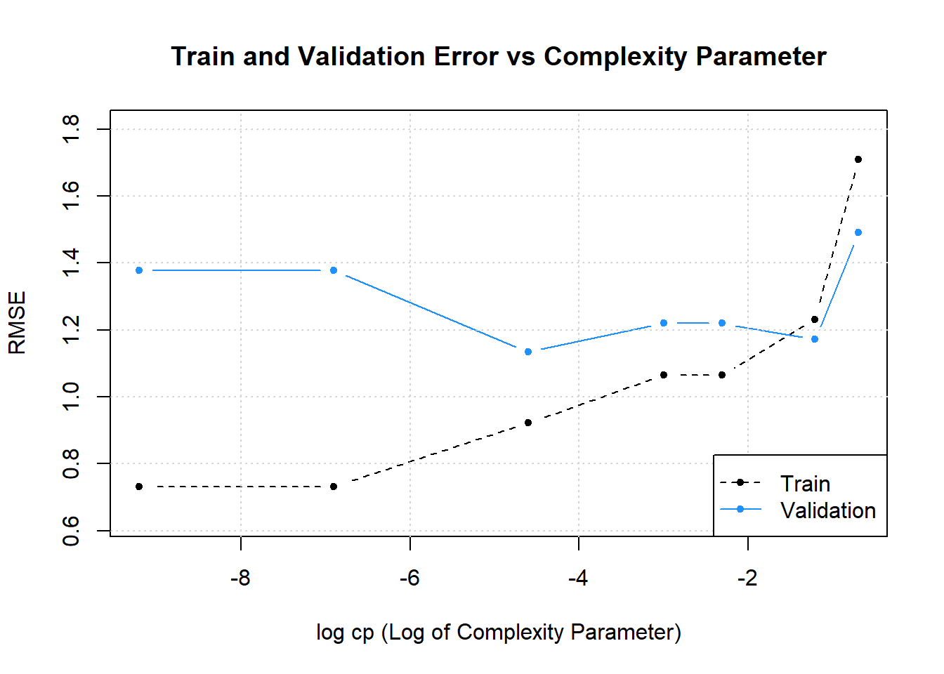 Lastly, we evaluate some decision tree models. We choose some arbitrary values of cp to evaluate, while holding minsplit constant at 5. There are arbitrary choices that produce a plot that is useful for discussion.