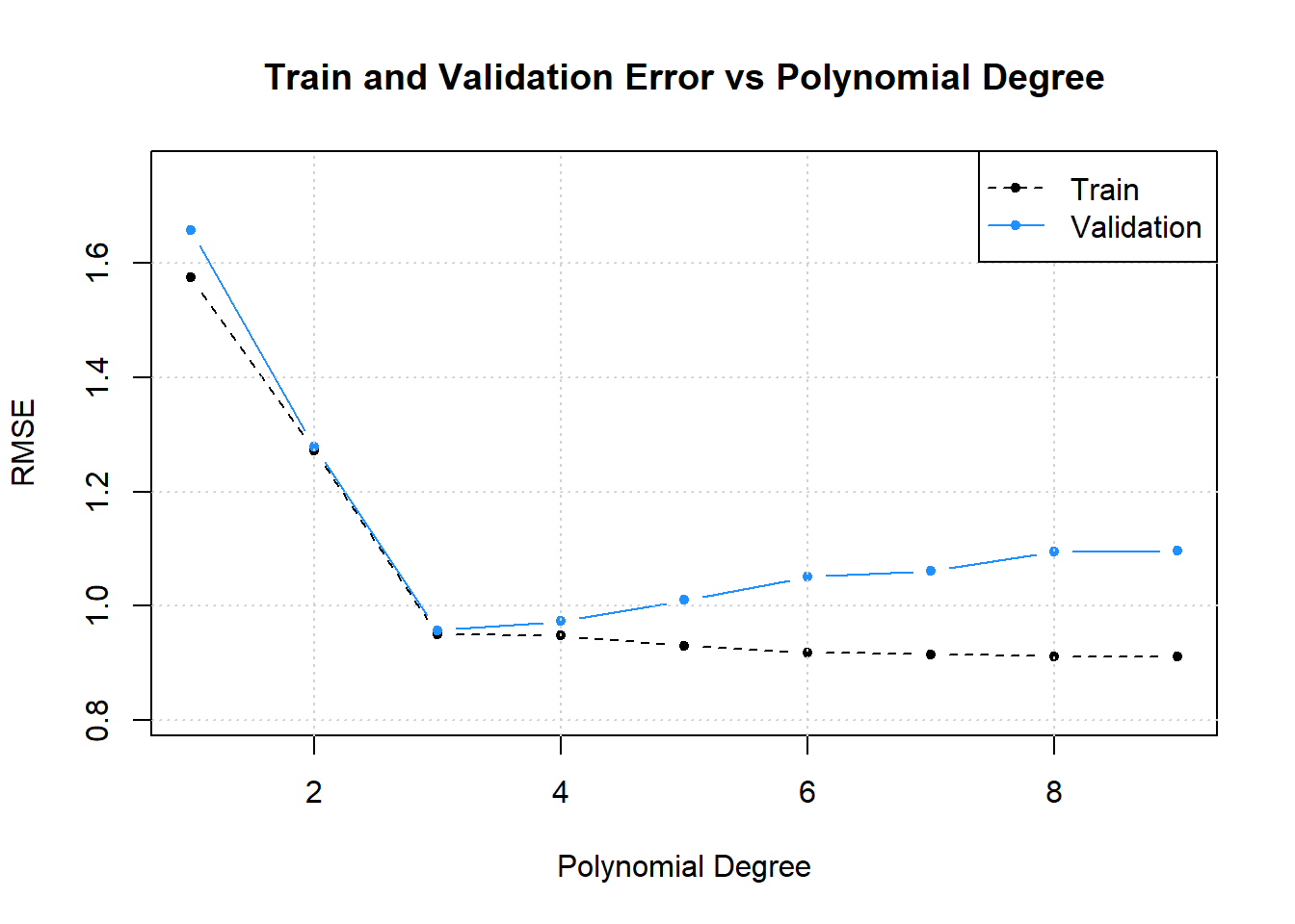 First up, linear models. We will fit polynomial models with degree from one to nine, and then validate.