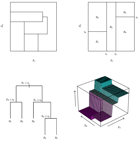 The decision trees (or “regression trees”) we previously saw were hopefully an intuitive way of partitioning out the predictor variable space into prediction areas. By “partitioning”, I mean chopping up the predictor space in a way that explains the data best, then using the resulting regions as the prediction for any value of the predictors. From ISLR Chapter 8:
