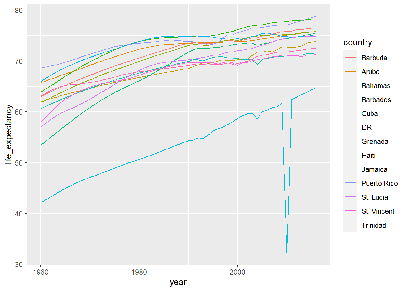 html_text(h)We don’t show the output here because it includes thousands of characters, but if we look at it, we can see the data we are after are stored in an HTML table: you can see this in this line of the HTML code above <table class="wikitable sortable">. The different parts of an HTML document, often defined with a message in between < and > are referred to as nodes. The rvest package includes functions to extract nodes of an HTML document: html_nodes extracts all nodes of different types and html_node extracts the first one. To extract the tables from the html code we use:
