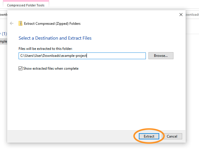 Unlike macOS, Windows does not automatically unzip things for you. If you double click on the .zip file, Windows will show you what’s inside, but it will do so without actually extracting anything. This can be is incredibly confusing! Here’s what it looks like—the only clues that this folder is really a .zip file are that there’s a “Compressed Folder Tools” tab at the top, and there’s a “Ratio” column that shows how much each file is compressed.