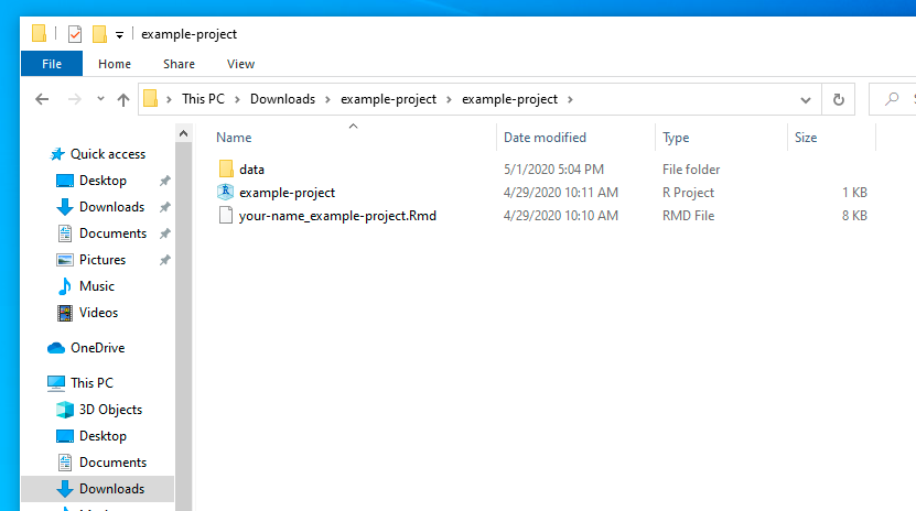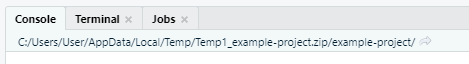 You should then finally have a real folder with all the contents of the zipped file. Open the R Project file and RStudio will point to the correct working directory and everything will work.